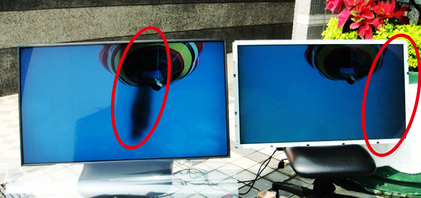 よく見かける屋外デジタルサイネージディスプレイ製品で、IP規格や環境温度は屋外仕様を満たしているように記載されていますが、直射日光下では利用できませんという注意事項が記載されているものがあります。これはまた別の要素で、屋外ディスプレイの最大の敵であるのは太陽光です。ディスプレイの特徴である「液晶」は温度が上昇すると中の液体が固まってしまう症状が発生します。これが良く見かける「液晶黒化」という画面の一部が黒くにじんでくる症状です。