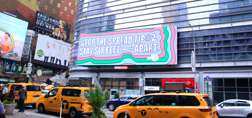 アメリカのNYタイムズスクエアにあるコカ・コーラのデジタルサイネージは2020年3月22日、1文字ずつブランドロゴの間隔をあけた広告を掲載しました。新型コロナウイルスの対策として提唱されているソーシャルディスタンスを呼びかけることを目的としています。ロゴの下部には「Staying apart is the best way to stay united.(みんなが共にいるためには、離れていることがもっとも良い)」というメッセージが表示されました。